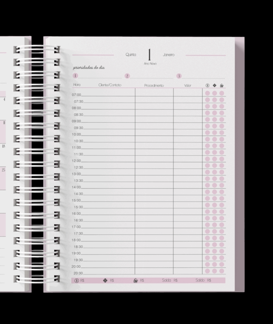 Página inicial, Dados pessoais, Calendários 2026 e 2027, Minhas metas, Minha saúde, Planejamento anual, Contatos, Logins e Senhas, é 1 dia por página, divisórias, planejamento, controle financeiro mensal, horários das 7 às 20:30, 418 páginas.