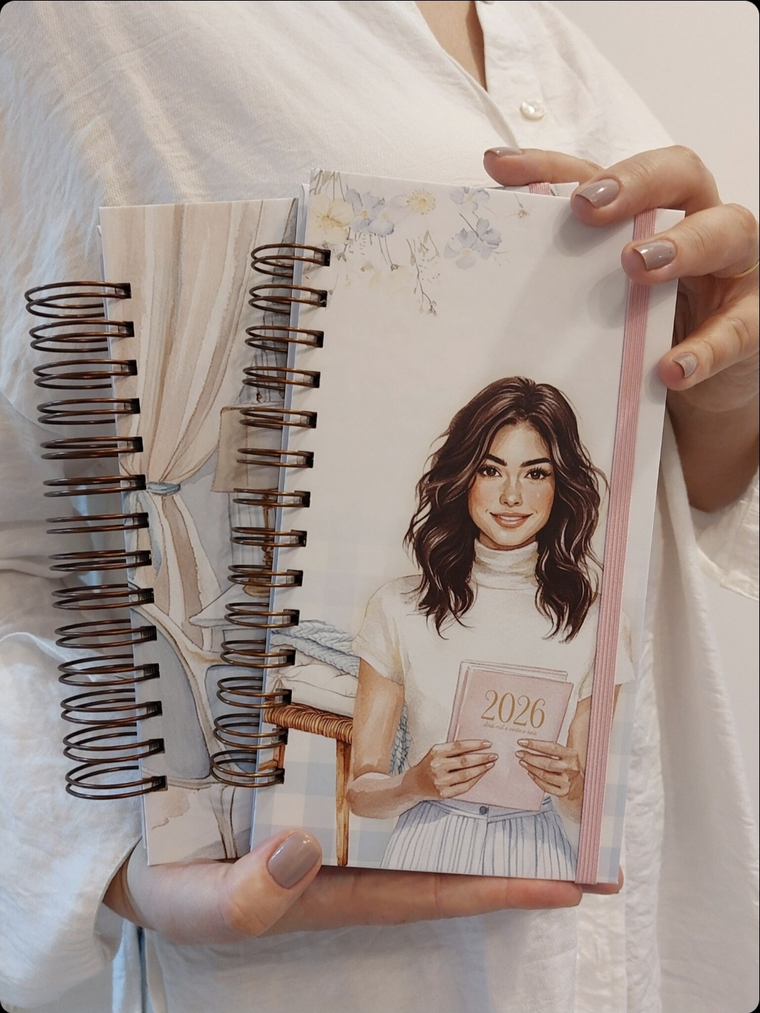 Página de apresentação, Dados pessoais, Calendários 2026 e 2027, Minhas metas, Para esse ano Comprar/Conquistar, Contatos, Logins e Senhas, Datas importantes, Dados bancários, Meus cartões, Contas parceladas, Minhas viagens, Lugares para visitar, Livros para ler, Filmes para ver, Calendário menstrual, Em cada mês: Divisórias mensais com abas, Calendário mensal em 2 páginas, Semana em 2 páginas formato box horizontal, Controle financeiro mensal, Meu mês, Página para anotações.